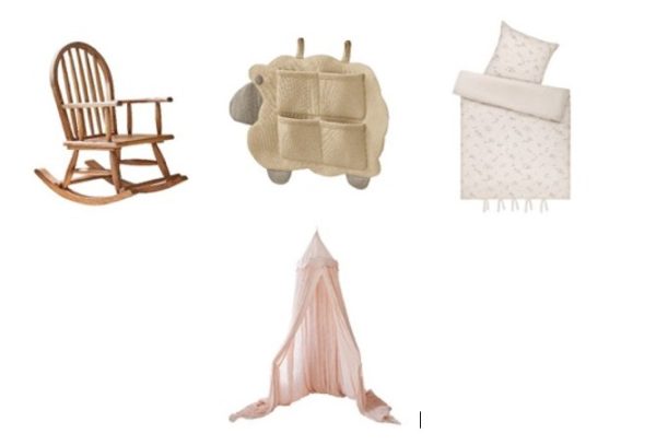 Zleva: dětské houpací křeslo, 5 948 Kč, nástěnný kapsář 648 Kč, povlečení 2 348 Kč,