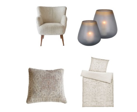 Zleva: křeslo, 15 498 Kč, svícny 898 Kč, povlak na polštářek 389 Kč, povlečení 2 578 Kč
