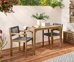 Balkonový set s kompaktním designem obsahuje jídelní stůl a dvě židle. Židle s textilním výpletem lze kompletně uložit pod stůl, takže ušetříte místo, což je ideální pro malé balkony nebo terasy. Nábytek je vyroben z olejovaného akáciového dřeva s certifikací FSC® s teakovým vzhledem. Souprava je vybavena chrániči podlahy, které zajišťují, že váš balkon nebo terasa zůstanou nepoškozené a bez škrábanců.