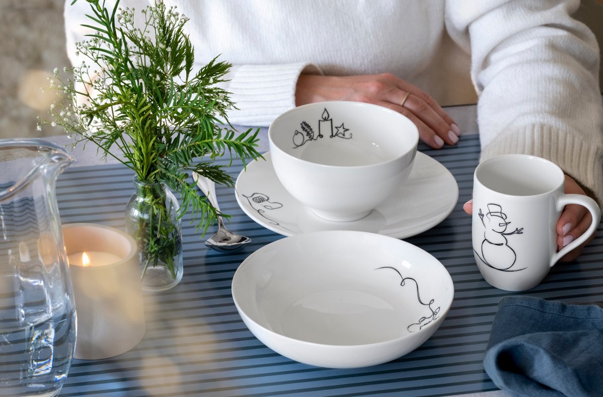 Bílé nádobí s oblými tvary zdobí ladná černá linka, která se stáčí v motivy vánočního perníčku, sněhuláka, soba nebo přání šťastných svátků. Hlavní myšlenkou kolekce Statement je radost, lehkost a nekomplikovanost, která se tentokrát přenesla na hrnky, misky či talíře.
