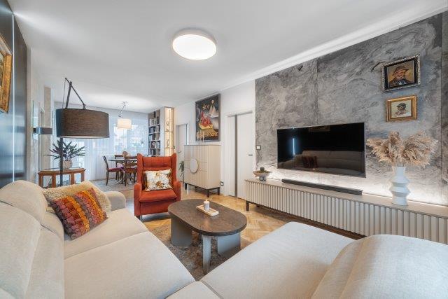 Srdcem bytu je obývací pokoj s několika zónami. Dominantou prostoru je luxusní kamenná dýha na stěně s televizí. Je to přírodní kámen nařezaný na tenké pláty, které se následně lepí přímo na stěnu. Každý kus je originál a designérka ho jela osobně vybrat i s majiteli. Každý kámen má totiž jinou kresbu, hrubost i barvu. Pro tento konkrétní se nadchli všichni tři.