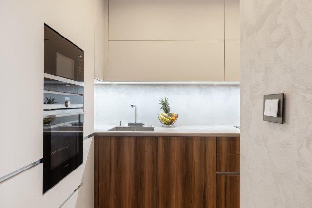 „Pro kuchyňskou linku jsem volila kvalitní chytré materiály, které jsou krásné i praktické v jednom. Třeba pracovní deska z kompaktu je velmi odolná vůči vodě a umožňuje také využití šikovného podstavného dřezu. A na kuchyňská dvířka jsem zvolila proti otiskový materiál, se kterým odpadá otravná nutnost v jednom kuse leštit povrch,“ popisuje designérka Jandíková.
