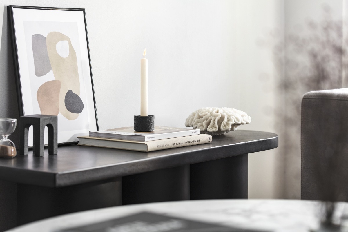 Jednoduchý svícen na dlouhou svíčku doplňují tři další varianty se skleněným obvodem. Sklo dodává svícnům eleganci a kontrast s „kamenným“ motivem jim propůjčuje sofistikovanost. Svícny lze mezi sebou kombinovat. Dobře vyniknou také na terase nebo za oknem.