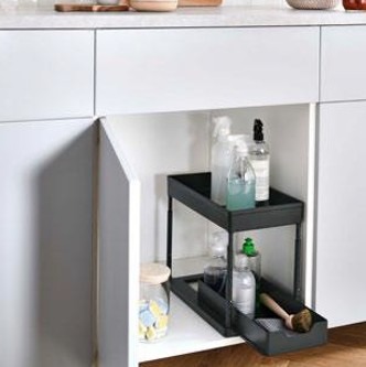 Dvoupatrový organizér do kuchyně, koupelny nebo kanceláře umožňuje efektivní využití prostoru ve skříňce, což je zvláště užitečné v menších domácnostech. Spodní přihrádku lze vysunout. Organizér v černé barvě je vybaven čtyřmi protiskluzovými nožičkami. Montáž je velmi snadná.