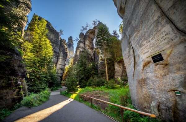 Přímo v Adršpachu, nedaleko zámku, odbočíte ze silnice vlevo a po červené značce stoupáte směrem na Liščí sedlo a zámeček Bischofstein. Stoupání vám zpestří překrásné výhledy na Adršpašské skály s dominantní věží Král. Po půl hodině šlapání se vám otevře nádherný pohled na Martinské stěny v Teplických skalách.