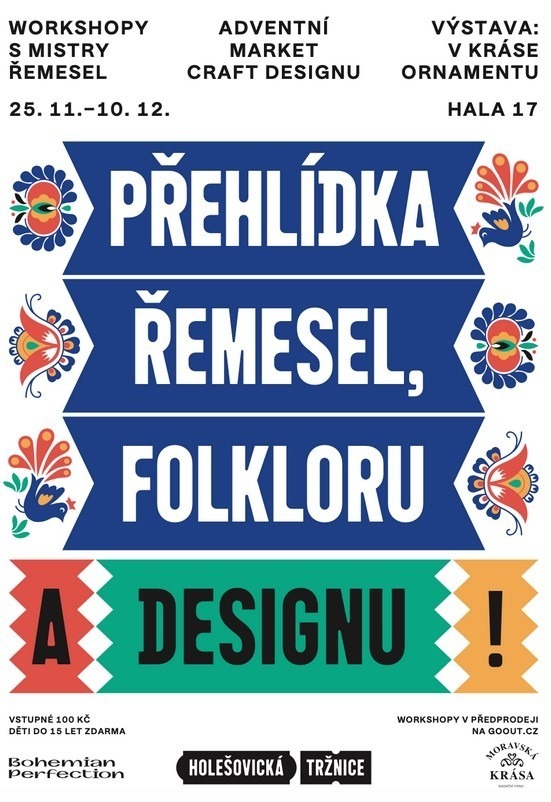 Řemesla, folklor a design v Holešovické tržnici – unikátní spolupráce Holešovické tržnice, platformy Bohemian Perfection a Nadačního fondu Moravská krása nabídne prodejní přehlídku tradičních i designových řemeslných výrobků, výstavu s názvem V kráse ornamentu a desítky workshopů s mistry řemesel. To je hlavní letošní nadílka Adventu v Tržnici vedle oblíbeného zimního kina a svařáku nebo prodeje kaprů a vánočních stromků Bez obalu. Přehlídka řemesel, folkloru a designu opanuje Halu 17 od 25. 11. do 10. 12. a zimní kino pak najdou návštěvníci na plácku u Haly 22 každý adventní čtvrtek.
