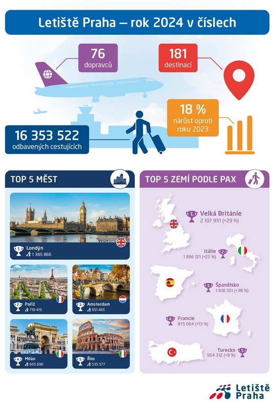 Za rok 2024 prošlo Letištěm Václava Havla Praha dohromady 16 353 522 cestujících a bylo vykonáno 134 609 startů a přistání letadel. Počet cestujících meziročně vzrostl o 18 %. Pražské letiště během loňska ve spolupráci s leteckými dopravci zprovoznilo 41 nových linek a celkem nabídlo přímé spojení do 181 destinací.
