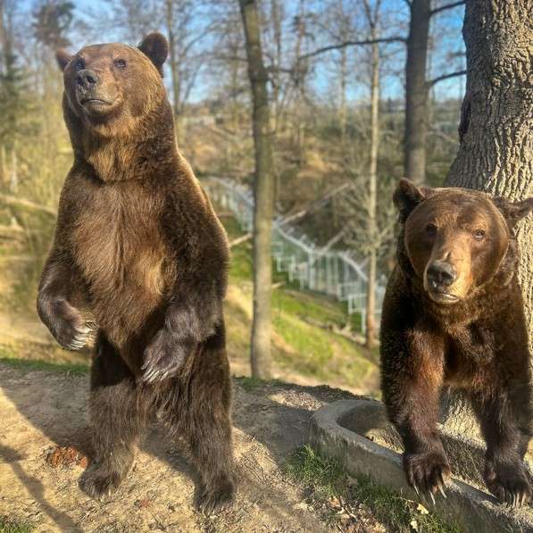 Největším labužníkem a jedlíkem táborské zoologické zahrady je medvěd hnědý John, který je zároveň i hlavou celé medvědí skupiny. Kromě něj ji tvoří ještě Max a Bubík. Obývají jeden z největších výběhů v pro medvědy v celé střední Evropě. Tvoří ho velkorysá rokle, na jejímž nejnižším místě je jezírko. Součástí přírodního výběhu jsou i vzrostlé stromy, které medvědům slouží ke šplhání. Největším mistrem v tom je nejmenší a nejsvětlejší Bubík, kterého nejčastěji můžete spatřit právě vysoko v korunách stromů, ve kterých dokáže strávit opravdu velmi dlouhé chvíle. Někdy k jeho vlastní škodě, protože často dorazí na pravidelné krmení poslední. Přesně proto chybí také na fotce ošetřovatelky Niny Martvoňové, které krásně pózují jen dva z medvědí trojice – John a Max. Možná budete mít větší štěstí než ona a o prodlouženém velikonočním víkendu se vám podaří na jednu fotku dostat všechny tři táborské medvědy naráz. Největší šanci budete mít při pravidelné komentovaném krmení, při kterém budete mít medvědy takřka na dosah ruky.