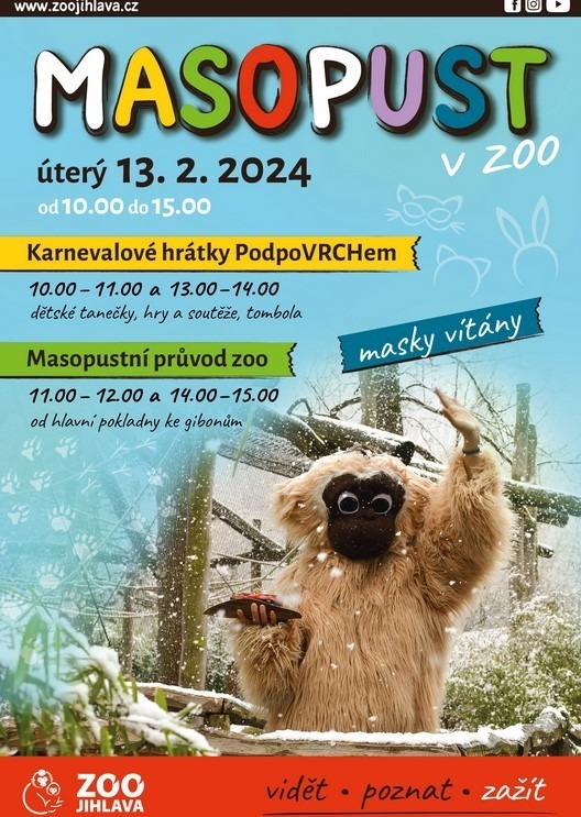 Speciálním dnem ale bude úterý 13. února. To se bude v zoo konat masopust! Zveme malé i velké na jedinečnou zábavu a barevné veselí v Zoo Jihlava! „Připojte se k nám ve zvířecích maskách a zúčastněte se masopustního průvodu, který projde naší zoo,“ zve vedoucí vzdělávacího centra PodpoVRCH Pavla Jarošová. Pro ty, kteří milují karnevalové hrátky, jsme připravili tanečky, hry a soutěže v centru PodpoVRCH. Karnevalové veselí začne v deset hodin a potrvá hodinu. Pak společně od hlavní pokladny vyrazíme s masopustním průvodem až ke gibonům. A komu se nechce ráno spěchat do zoo, může přijít až odpoledne, kdy si zopakujeme nejen veselé dovádění PodpoVRCHem, ale i průvod po zoo. Od 13 do 14 hodin budeme mít další kolo hrátek a ve dvě hodiny vyrazí odpolední průvod ke gibonům.