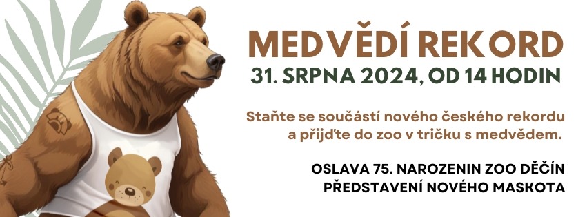Překonáváte rádi rekordy? Pokud ano, pak nesmíte na konci srpna 31. 8. od 14 hodin chybět v děčínské zoo! Nejenže se tu budou slavit 75. narozeniny zoo, ale navíc zde proběhne pokus o vytvoření nového českého rekordu! Ten bude spočívat v tom, aby se v zoo sešlo co nejvíce lidí v tričku s medvědem. Celou akci posvětí Agentura Dobrý den z Pelhřimova, která rekord zapíše do české knihy rekordů a kuriozit. „Medvědi patřili k děčínské zoo v podstatě od jejích počátků a všichni milují toho našeho současného – medvěda kamčatského Bruna, tak bylo téma narozeninových oslav jasné,“ uvedla mluvčí zoo Alena Houšková.