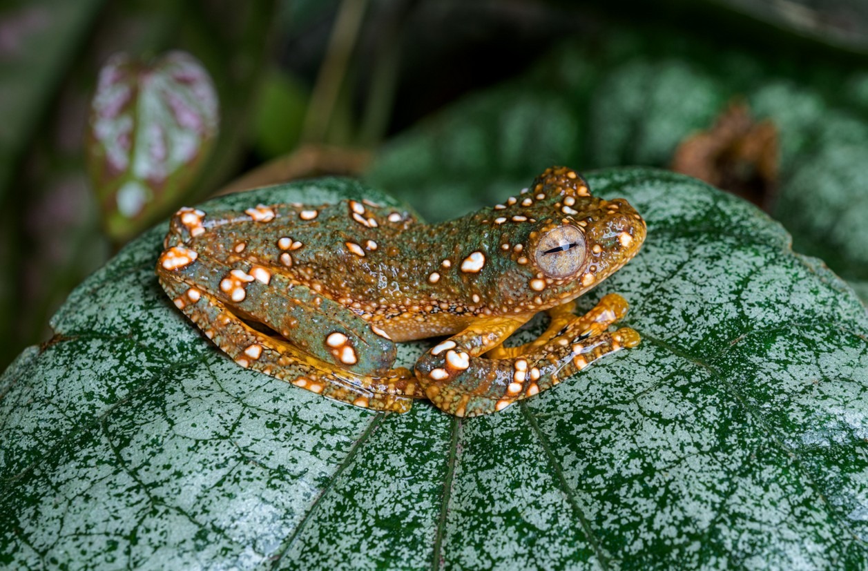 Foto 1: Mladé žabky ještě nemají schopnost klouzavého letu a jejich kůže je jasně červená a bradavičnatá. Foto Petr Hamerník, Zoo Praha