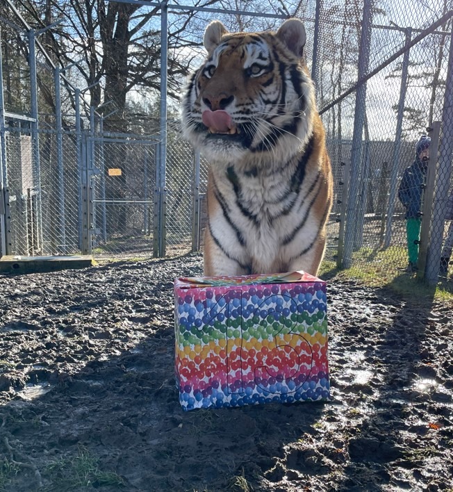 Ošetřovatelé z táborské zoo tygrovi Rockymu zabalili jeho nejoblíbenější pochoutku – pořádný kus masa. FOTO: ZOO Tábor/Barbora Kubíčková