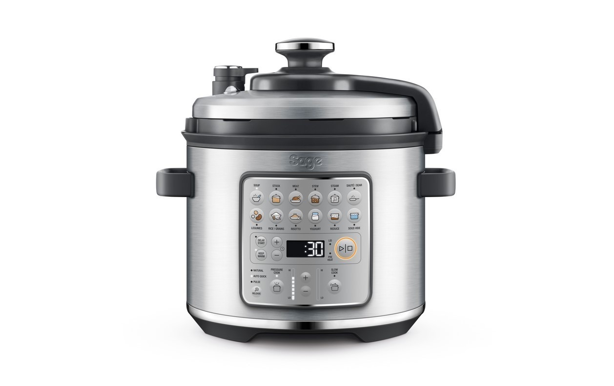 - Vyjměte nádobu z tlakového hrnce SAGE SPR680BSS a do ¾ jejího objemu nalijte studenou vodu. Vložte zpět do tlakového hrnce a uzavřete otočením madla hrnce po směru hodinových ručiček. Jakmile je víko správně uzamčené, zazní zvukové upozornění. Vložte do zásuvky a přístroj se sám zapne na funkci SOUP.