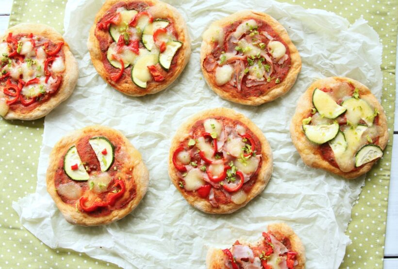 Každou placku potřete rajčatovou omáčkou a podle chuti a fantazie obložte šunkou, zeleninou. Můžete použít i tuňáka, olivy, cibulku nebo další oblíbené ingredience.