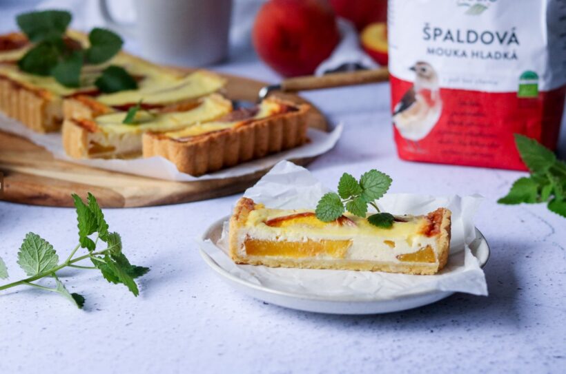 Do korpusu vyskládejte nakrájené broskve a zalijte tvarohovou náplní. Pečte 35 minut.