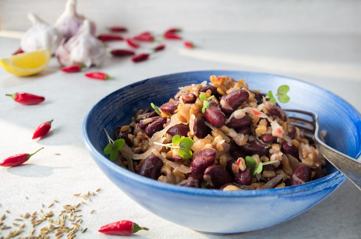 Jednozrnku předem namočte i 24 hodin, zkrátíte tak dobu jejího varu a zlepšíte její výživové vlastnosti. Poté připravte dle návodu na obale. Na pánvi osmažte nadrobno nakrájenou cibuli, poté ji posypte třtinovým cukrem a nechte lehce zkaramelizovat. Přidejte římský kmín, chilli papričku, utřený česnek a nechte provonět. Přidejte fazole a počkejte, dokud se neodpaří voda. Vmíchejte uvařenou jednozrnku a nechte směs prohřát. Nakonec ochuťte citronovou šťávou, dosolte, opepřete a přidejte kysané zelí. Ihned podávejte.