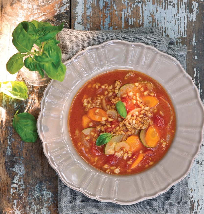 Uvařte jednozrnku: 100 g jednozrnky propláchněte a nechte máčet několik hodin v 250 ml vody (pospícháte-li, stačí 2 hodiny, v opačném případě klidně celou noc). Ve stejné vodě přiveďte k varu a vařte se špetkou soli pod pokličkou cca 45 minut – použijte malý kastrůlek se silným dnem. Čím kratší doba máčení, tím delší doba vaření, tím pádem budete potřebovat i více vody. Vodu dle potřeby dolévejte po troškách v průběhu vaření. Očištěnou zeleninu nakrájejte a na olej dejte nejprve opékat cibuli, mrkev, pokrájený česnek a čerstvý rozmarýn. Po chvíli osolte, přidejte oloupaná a na větší kusy nakrájená rajčata, horkou vodu, zeleninový bujon a přiveďte k varu. Po 10 minutách přidejte řapíkatý celer (hrst řapíkatého celeru si ještě nechte stranou), vařenou jednozrnku a vše vařte dalších 5 minut, aby jednozrnka natáhla chutě a vůně. Vypněte, přidejte zbytek řapíkatého celeru, dochuťte dle potřeby solí, čerstvě mletým pepřem a olivovým olejem. Před servírováním vyndejte větvičky rozmarýnu.