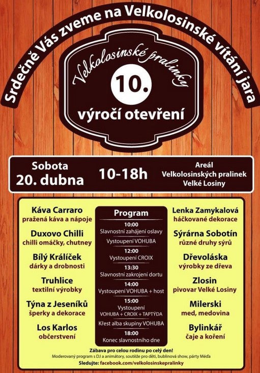 Velkolosinské vítání jara aneb 10. výročí Velkolosinské pralinky se koná v sobotu 20. dubna 2024 od 10:00 do 18:00 hodin v čokoládovém areálu Velkolosinských pralinek ve Velkých Losinách (vedle zámecké sýpky). Kromě ochutnávky přírodních ovocných likérů Ratafia Almond Spirit v otevřených pralinkách se mohou návštěvníci těšit na spoustu dobrot nejen z čokolády, ale také na zábavný program pro celou rodinu po celý den – moderovaný program s DJ, soutěže pro děti, bublinovou show, párty Méďu, hudební vystoupení skupin Vohuba, Croix a Taptýda.