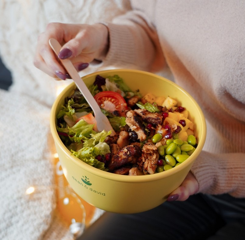 Každé jídlo v dean&david je připravováno pouze z pečlivě vybraných přírodních surovin, bez použití jakýchkoliv umělých přísad či dochucovadel. Klíčovou roli zde hraje také udržitelnost – od opakovaně použitelných obalů až po biologicky rozložitelné misky či recyklované tašky.