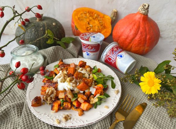 - Servírování: Opečenou dýni podávejte horkou. Na talíři doplňte nasekanými vlašskými ořechy, polníčkem a hlavně bílým jogurtem, který pokrmu dodá příjemnou svěžest. Nakonec můžete vše jemně zakápnout olivovým olejem pro extra chuť.