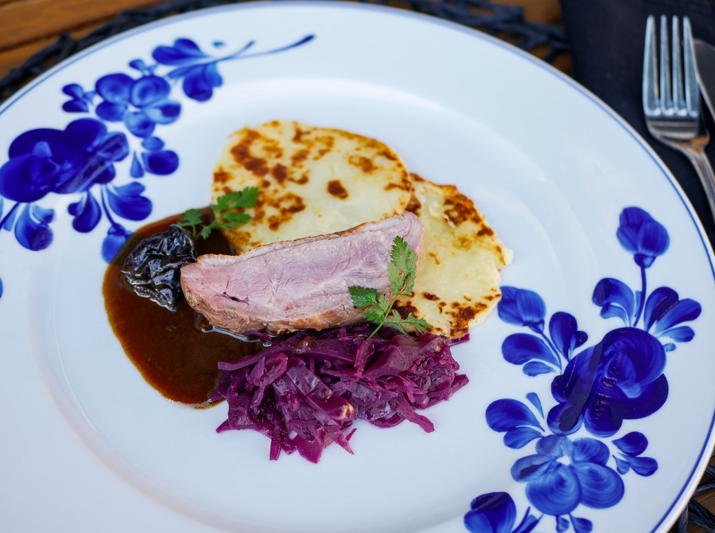 Kachní prso s červeným zelím a marinovanými švestkami, bramborové placky