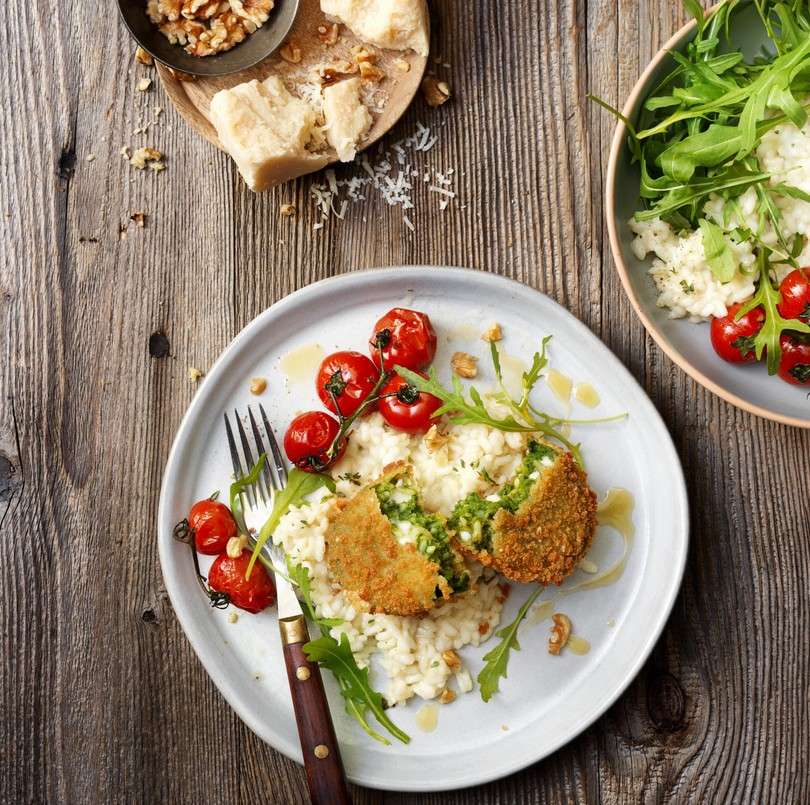- Mezitím si připravíme Garden Gourmet Špenátovo-sýrový řízek podle návodu na obalu. Rýže by měla být měkká, akorát na skus, tzv. al dente. Ochutnejte a případně dokořeňte. Do rizota vmícháme polovinu parmezánu.