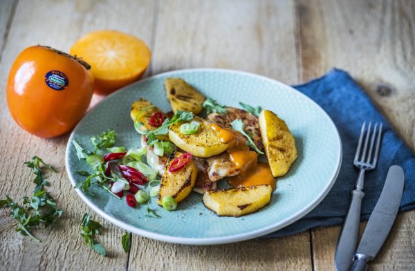 Kuřecí plátky s pečeným kaki jsou originálním způsobem, jak spojit maso s ovocem a dodat mu zcela nový rozměr. Sladkost kaki zkaramelizovaného s třtinovým cukrem se příjemně doplňuje s máslovou chutí a pikantností chilli. Výsledkem je šťavnatý a voňavý pokrm, který ozvláštní každou večeři.
