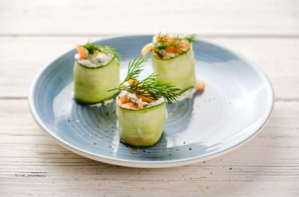 V létě hraje zelenina hlavní roli – a nemusíme zůstat jen u salátů. Okurka, která je z 95 % tvořená vodou, skvěle funguje i jako základ studených rolek. Pomocí ostrého nože nebo škrabky ji nakrájejte na dlouhé tenké plátky, potřete tvarohovou pomazánkou, přidejte kousek uzeného lososa a zarolujte. Stačí zajistit párátkem, ozdobit bylinkou a lehká letní jednohubka je hotová.
