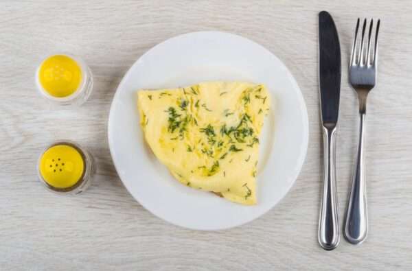 - Když se začnou okraje omelety zabarvovat, přidejte směs zeleniny s houbami. Poté opatrně omeletu zarolujte a přendejte na talíř.