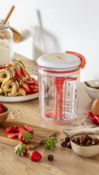 S přípravou těsta vám ušetří práci praktický ruční mixér Tefal Pancake Express, se kterým nepotřebujete váhu, odměrku ani metličku. Stačí vložit ingredience podle jednoho ze tří integrovaných receptů, 30 vteřin tahat za lanko a máte dokonale hladké těsto. Navíc je přenosný a funguje bez elektřiny, takže ho můžete použít kdekoliv.