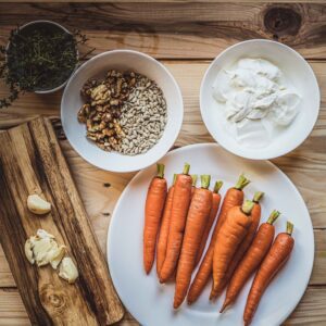 - Tvaroh v misce výrazně osolte a promíchejte. Pečenou mrkev dejte do mísy. Zakápněte zbylým olejem. Přidejte med, ocet, vlašské ořechy a slunečnicová semínka. Nakonec přidejte nasekanou mrkvovou nať. Promíchejte a servírujte spolu se soleným tvarohem.