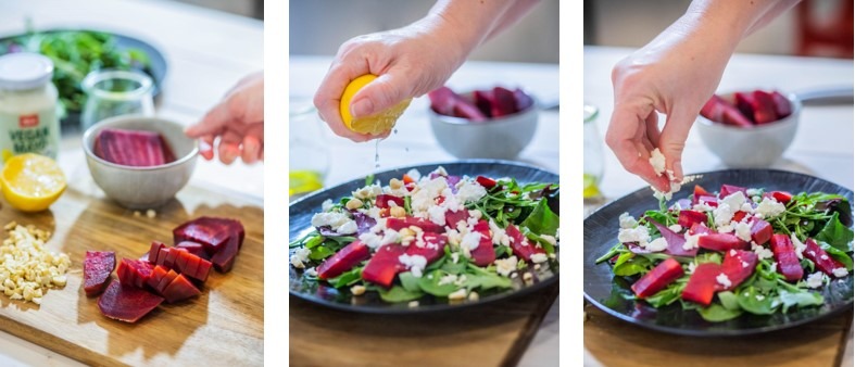 Jako základ salátu se hodí rukola, listový salát či jarní salátová směs. Červenou řepu, která je hlavní hvězdou jídla, můžete doplnit i plátky jablka či hrušky. Dodáte tak pokrmu spolu s pekanovými, vlašskými či kešu ořechy křupavost a zvýrazníte nasládlou chuť sýra.