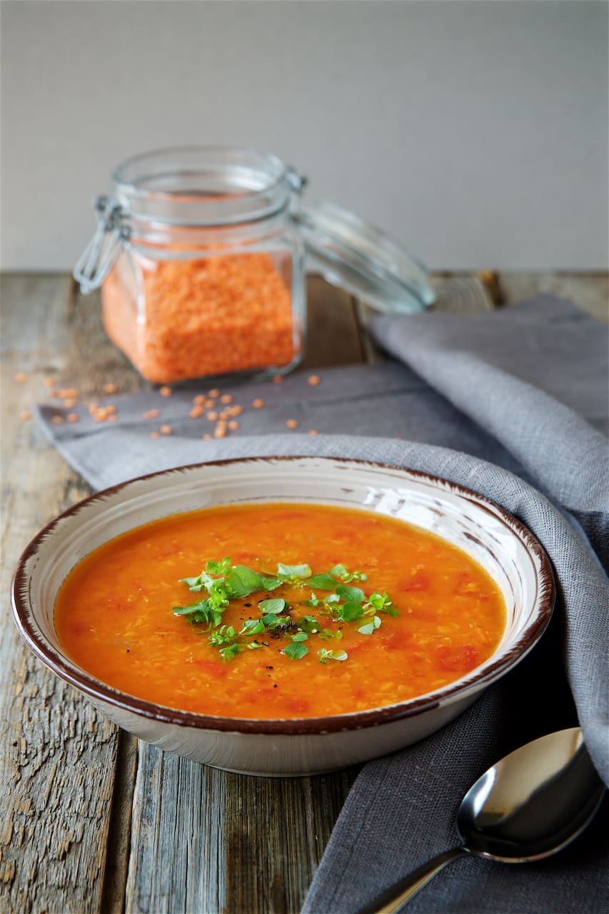 Na olivovém oleji osmažíme cibuli, mrkev a celer. Přidáme česnek, zázvor, římský kmín, kurkumu, rajčata, čočku a sůl. Promícháme a zalijeme vývarem s vodou. Vaříme do změknutí čočky. Část polévky můžeme rozmixovat. Přidáme špenát a dochutíme citronovou šťávou.
