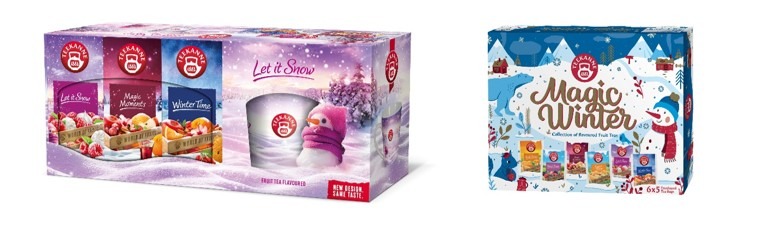 Příchod zimy přímo vybízí k tomu uvařit si šálek čaje se sladkou, hřejivou a kořenitou chutí. Přesně takové vám nabídne dárková kolekce TEEKANNE Let it Snow. Dokonalým společníkem pro dlouhé zimní večery bude čaj Winter Time s ovocem a skořicí nebo Magic Moments, ve kterém se voňavá skořice snoubí s tóny pomeranče a rumu. Sladkou hravost v sobě má čaj Let it Snow, ve kterém si vychutnáte kombinaci malin, smetany a sněhových pusinek. Součástí sady je také hrníček se zasněženým motivem, který perfektně doladí zimní atmosféru. Kolekce čajových sáčků TEEKANNE Magic Winter je vedle výše zmíněných obohacena ještě tři o ovocné příchutě Fresh Orange,