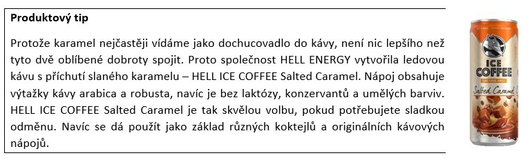 Na celý koktej budeme potřebovat pět ingrediencí – vodku, kávový likér, 1 shot espressa, 60ml mléka a karamelový sirup. Začneme tím, že do shakeru přidáme led, nalejeme 30 ml vodky, 30 ml kávového likéru, do mixu dodáme 25 ml espressa, mléko a 10 ml karamelového sirupu se špetkou soli. Vše velmi pečlivě promícháme za pomocí shakeru a přelejeme do sklenice na martini. Nápoj lze ozdobit kávovými zrny nebo badyánem. Pokud chceme, můžeme drink dokořenit skořicí či posypat kakaem, a pak rovnou podávat. Ovšem pro jednoduchost lze místo espressa, mléka a sirupu použít již hotový kávový nápoj, například HELL ICE COFFEE s jemnou příchutí slaného karamelu. Medová stopa po karamelových bonbónech se solí dodá tomuto drinku šmrnc. Koktej se zaručeně stane hitem každého večírku.