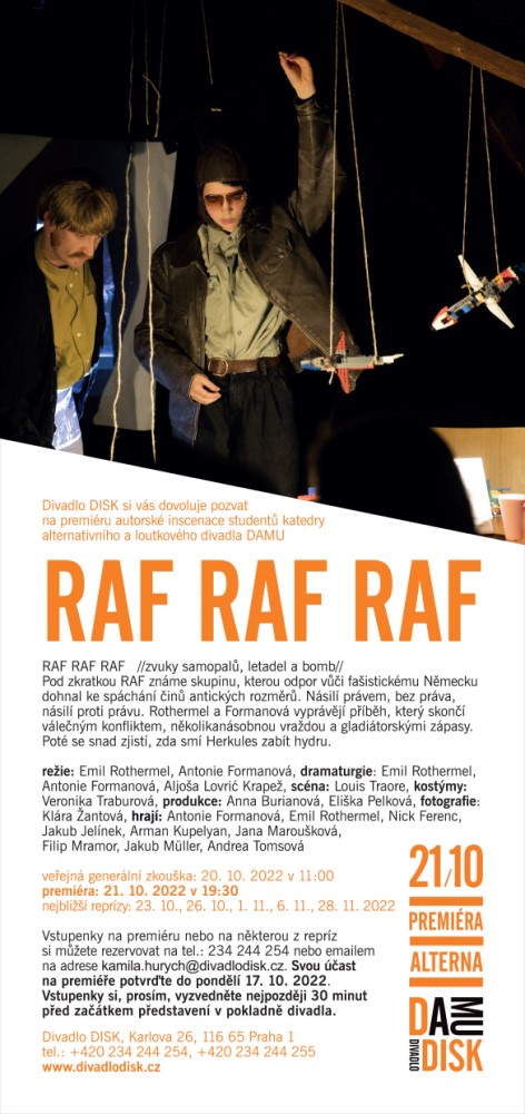 Divadlo DISK uvede v pátek 21. října v 19:30 inscenaci studentů katedry alternativního a loutkového divadla DAMU s názvem RAF RAF RAF. Režijní dvojice Emil Rothermel a Antonie Formanová v ní rozvádí koncept lecture performance, který byl pod názvem RAF uveden na klauzurách katedry v lednu 2022.