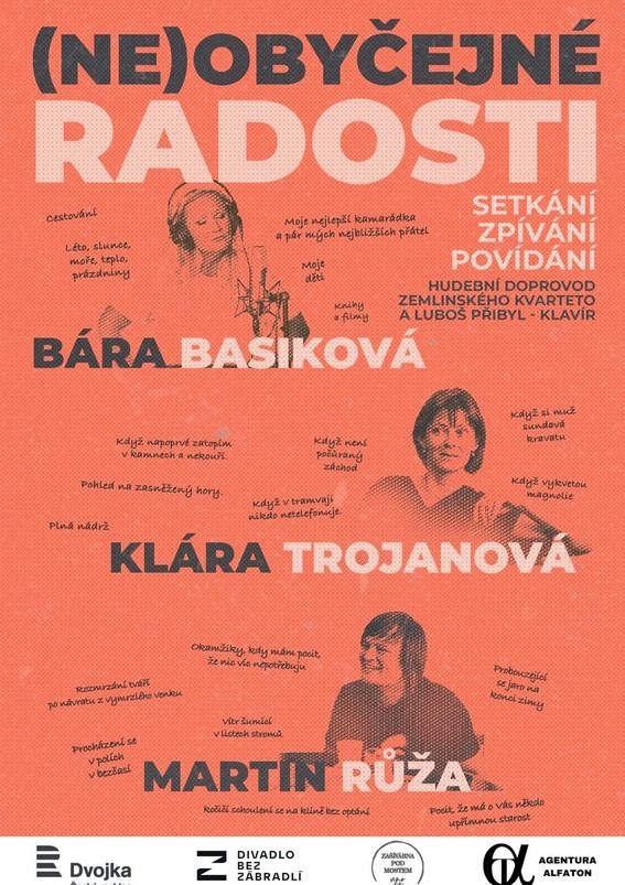Šanson, humor, skleněné srdce pro Dagmar Havlovou i zvukař od Céline Dion! Pražské Divadlo Bez zábradlí zažilo výjimečný večer. Premiéra nového hudebního projektu (NE)OBYČEJNÉ RADOSTI přinesla jedinečné spojení šansonu, evergreenů, humoru a laskavé nostalgie v podání tří výjimečných interpretů – herečky Kláry Trojanové, zpěvačky Báry Basikové a fenomenálního zpěváka s unikátním hlasovým rozsahem Martina Růži. Atmosféru dotvářel mistrovský doprovod Zemlinského kvarteta a klavíristy Luboše Přibyla.