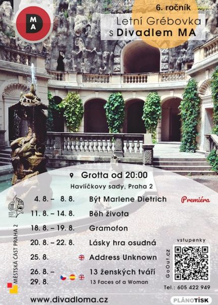 Divadelní festival Letní Grébovka s Divadlem MA se odehraje mezi 4. a 29. srpnem a nabízí celkem dvacet večerů autorských inscenací nezávislého spolku. Vedle již zmíněné premiéry budou na programu inscenace Běh života, Gramofon, Lásky hra osudná, Address Unknown a 13 ženských tváří. Vstupenky je možné zakoupit na místě nebo v předprodeji v síti GoOut v kategoriích od 150 do 780 Kč. V prvním týdnu od 4. do 8. srpna se hraje od 20.30 hodin, zbývající představení začínají od 20 hodin. Další informace o programu a divadle jsou dostupné na www.divadloma.cz nebo v události na Facebooku. Letní Grébovka s Divadlem MA se koná pod finanční záštitou Městské části Praha 2 a Nadace Život umělce. Umělecký patronát nad projektem drží světoznámý klavírista Jevgenij Kissin.