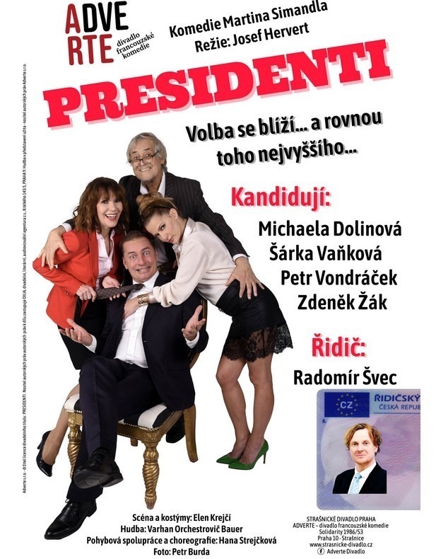 Víkend plný kultury začíná v sobotu odpoledne, kdy na diváky čeká původní česká komedie Presidenti, která je novinkou letošního roku. Od březnové premiéry se s úspěchem hraje po celé republice a nabízí neúprosný pohled do zákulisí politiky, samozřejmě kdy jindy, než před prezidentskými volbami. Jako premiér se představí Petr Vondráček, v roli místopředsedy uvidíte známého divadelního barda Zdeňka Žáka. Další místopředsedkyni si zahraje Michaela Dolinová a jednou z poslankyní je i Šárka Vaňková, zpěvačka, která hraje svou první činoherní roli. Presidenti ve Strašnickém divadle začínají v 15 hodin.