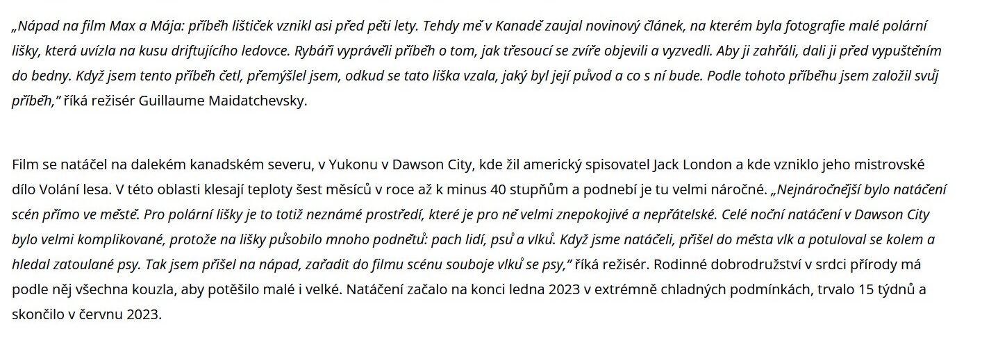 Nový rodinný snímek určený malým i velkým dětem a dospělým Max a Mája: Příběh lištiček přenese diváky do unikátního světa polárního prostředí. Sníh, mráz, ale také láska a odvaha jsou hlavními aspekty příběhu inspirovaného událostí, která se doopravdy stala. Hlavní role představují dvě reálné polární lišky a jejich blízké okolí, snímek se natáčel v autentickém srdci přírody – v extrémně mrazivém prostředí severní Kanady. Premiéra snímku Max a Mája: Příběh lištiček proběhne v českých kinech 22. února 2024.