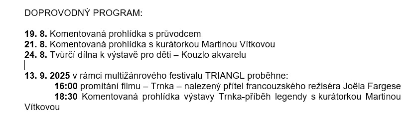 Součástí expozice jsou i projekce několika filmů, interaktivní průvodci, knihovnička s Trnkovými knihami a herna pro děti. Galerie připravila i bohatý doprovodný program v podobě tvůrčích dílen a komentovaných prohlídek. Kurátory výstavy jsou Martina Vítková a Jan Trnka. V průběhu prázdnin je výstava navíc otevřena v prodloužené otevírací době, každý den vyjma pondělí od 11 hodin.