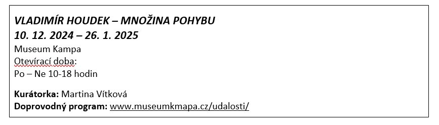 Poslední výstavou roku 2024 je v Museu Kampa je přehlídka nových obrazů Vladimíra Houdka. Houdek, který nedávno oslavil kulaté 40. narozeniny, je jedním z nejvýraznějších malířů své generace. Je absolventem pražské akademie, poprvé na sebe upozornil již v roce 2010, kdy získal Cenu kritiky za mladou malbu. O dva roky později se stal laureátem Ceny Jindřicha Chalupeckého a dodnes je jediným umělcem, který získal obě tato prestižní ocenění. Houdek má za sebou množství výstav doma i v zahraničí, výstava v Museu Kampa je jeho první muzejní výstavou po pěti letech. K vidění na ní je výběr z jeho nejnovějších obrazů, ve kterých se vrací ke geometrické abstrakci v kombinaci černé a žluté.