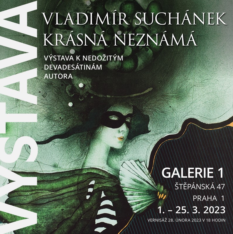 Výstava nazvaná Vladimír Suchánek – Krásná neznámá, stejně jako nedávno uvedený dokumentární film, prezentuje stěžejní část jeho tvorby. Barevné litografie z let 1983 až 2019 přenášejí diváka do světa fantazie a iluze, světa ovládaného zvláštní nostalgií, ve kterém si umělec pohrává s metaforou a symbolem. Typickým námětem jeho obrazů je ženská figura, chápaná jako symbol bytosti zranitelné a křehké, současně však i silné a plné emocí. Tyto elegantní a tajuplné postavy se zpravidla pohybují kdesi na hraně snu a skutečnosti. Pocit vytržení z prostoru a času podtrhují záměrně použité atributy – masky, vějíře, škrabošky nebo ulity, stáčející se do nekonečných fantastických spirál.