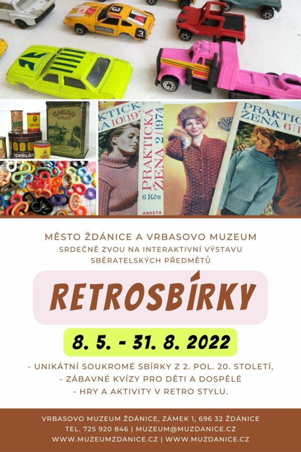 Unikátní výstava RETROSBÍRKY ve Ždánicích představuje soukromé sbírky z II. pol. 20. století. Cílem výstavy je nejen představit sběratelství jako vášeň, ale také ukázat dnešní generaci mladých lidí nebo dětí, co vše se v této době sbíralo. Uvidíte zde např. sbírku pohlednic, známek, nálepek od zápalek a sýrů, obaly od žvýkaček a čokolád, obaly od žiletek, sbírku propisek, hokejových puků, autíček apod. Součástí – tvořivá dílna pro děti.
