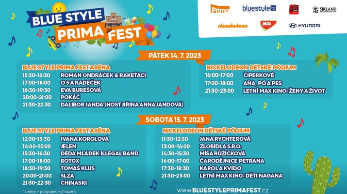 Největší rodinný festival BLUE STYLE PRIMA FEST je za dveřmi. Užijte si letní zábavu pro celou rodinu. Už 14. a 15. července 2023 v největším zábavním parku Šikland na Vysočině. Těší se na vás plejáda hvězd, např. Chinaski, Pokáč, Slza, Tomáš Klus, Jelen, Dalibor Janda nebo Eva Burešová. Dětské oči rozzáří Čiperkové, Zlobidla s.r.o., Míša Růžičková, Jana Rychterová nebo čarodějnice Petrana. Všechny věkové kategorie potěší setkání s oblíbenými herci a moderátory z televize Prima a jejich autogramiáda. Užijete si také ten nejvymazlenější doprovodný program. Akci zajišťuje primácká agentura SOLOOTIONS ve spolupráci s rádiem Kiss a Šiklandem. Takto širokou festivalovou nabídku jinde nenajdete! Další zábavu pro vás mají například MOL, Nickelodeon, Geisha či Herkules.