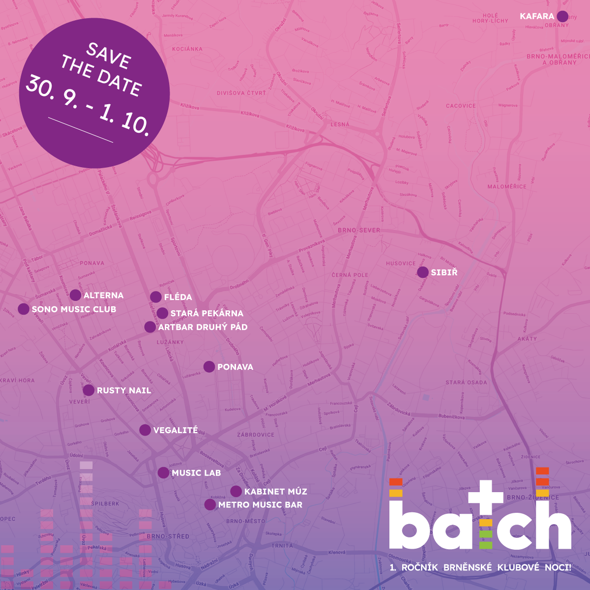 Batch, největší dávka klubové hudby v brněnské historii, propojí ve dnech 30. 9. – 1. 10. třináct klubů pestrým nadžánrovým hudebním programem za jednotné vstupné. Akci pořádá BACH – Brněnská asociace clubové hudby.