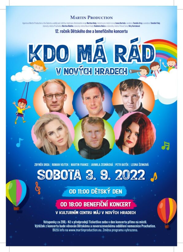 V sobotu 3. září 2022 se v jihočeských Nových Hradech uskuteční již 12. ročník Dětského dne a benefičního koncertu „Kdo má rád…“. Koncert se koná od prvního ročníku pod záštitou Jihočeského kraje a výtěžek z této benefice letos poputuje opět pro Dětské a novorozenecké oddělení nemocnice Prachatice.