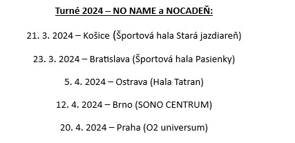 Oblíbená slovenská skupina NO NAME vyráží na turné společně s kapelou Nocadeň, koncertní šnůra začne 21. března 2024 v Košicích a velkolepé finále proběhne 20. 4. 2024 v O2 universum. NO NAME současně vydávají po osmi letech nové album s názvem V původnom znění.