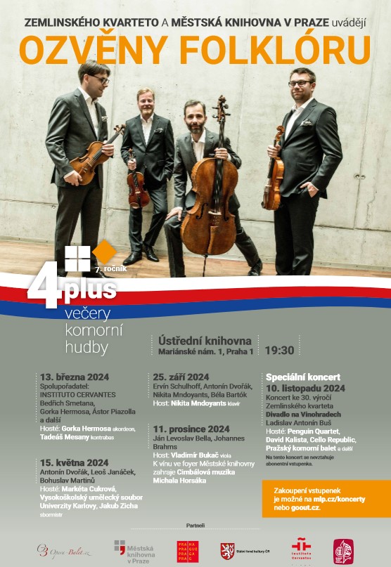 Ve Velkém sále Městské knihovny v Praze bude ve středu 13. března 2024 v půl osmé večer zahájen sedmý ročník komorní řady 4plus, kterou pořádá Zemlinského kvarteto ve spolupráci s Městskou knihovnou a španělským kulturním institutem Instituto Cervantes. Série bude letos reflektovat zajímavé téma – Ozvěny folklóru. Vydává se tedy jinou cestou než mnohé další festivaly, které (zcela logicky) připomínají Rok české hudby 2024.