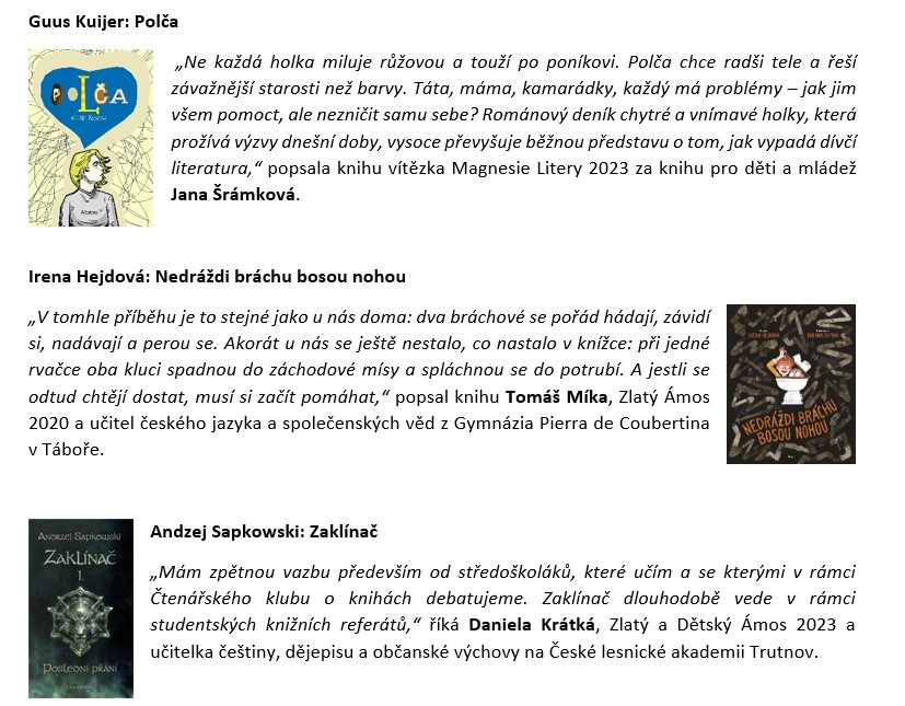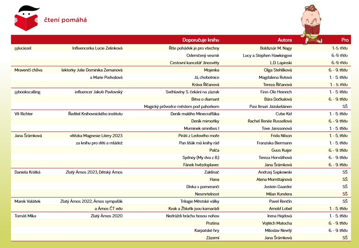 Děti během prázdnin ztrácejí motivaci ke čtení. Podle odborníků to může mít fatální následky. Projekt „Čtení pomáhá“ proto oslovil odborníky na literaturu, knižní influencery, učitele a knihovníky a spolu s nimi rozšířil svůj seznam knih. Dopřeje tak dětem větší výběr titulů, kterými mohou pomáhat potřebným. Své tipy dětem sdílela i držitelka Magnesie Litery Jana Šrámková či Zlatí Ámosové Tomáš Míka a Daniela Krátká anebo influencerka Lucie Zelinková (@luciezel), lektorky Julie Dominika Zemanová a Marie Podvalová (@mravencichuva), influencer Jakub Pavlovský (@bookscalling) a také Vít Richter, ředitel Knihovnického institutu. Seznam knih obohatí třeba Já, chobotnice, Fánek hvězdoplavec nebo Piráti z Ledového moře.